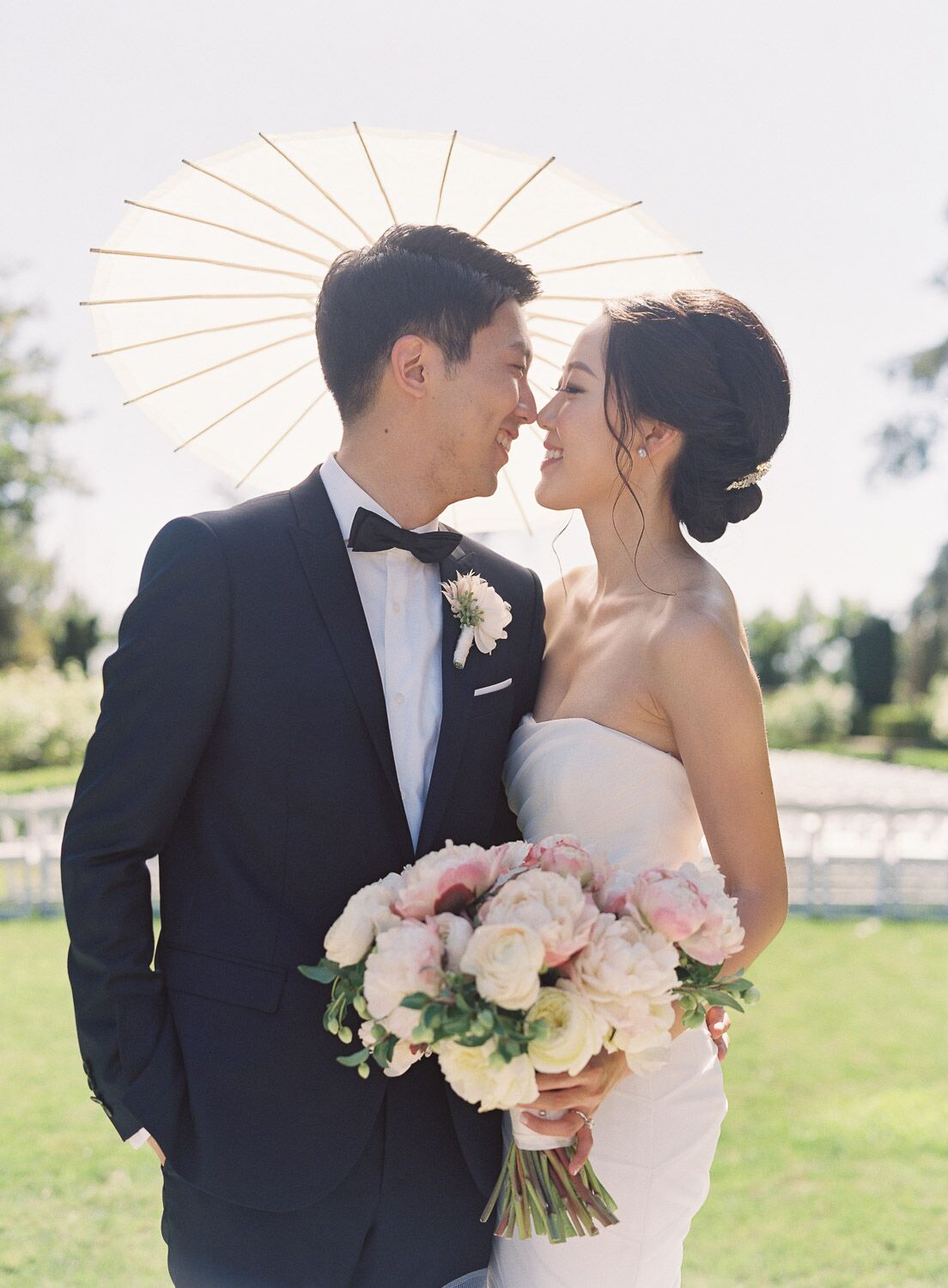 Photo of bride and groom facing each other about to kiss under a white parasol umbrella. Bride holding her wedding boutique of blush pink peonies flowers.